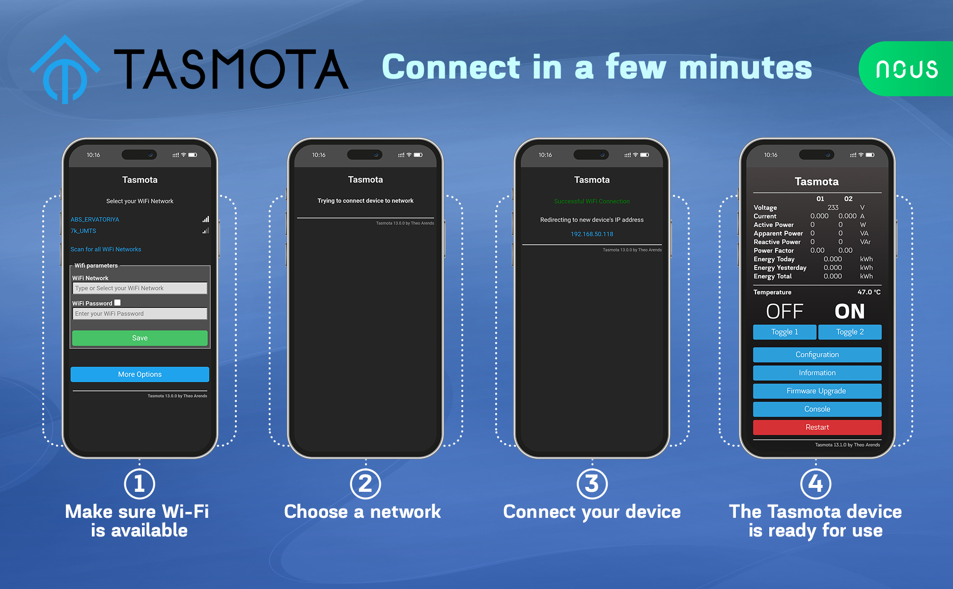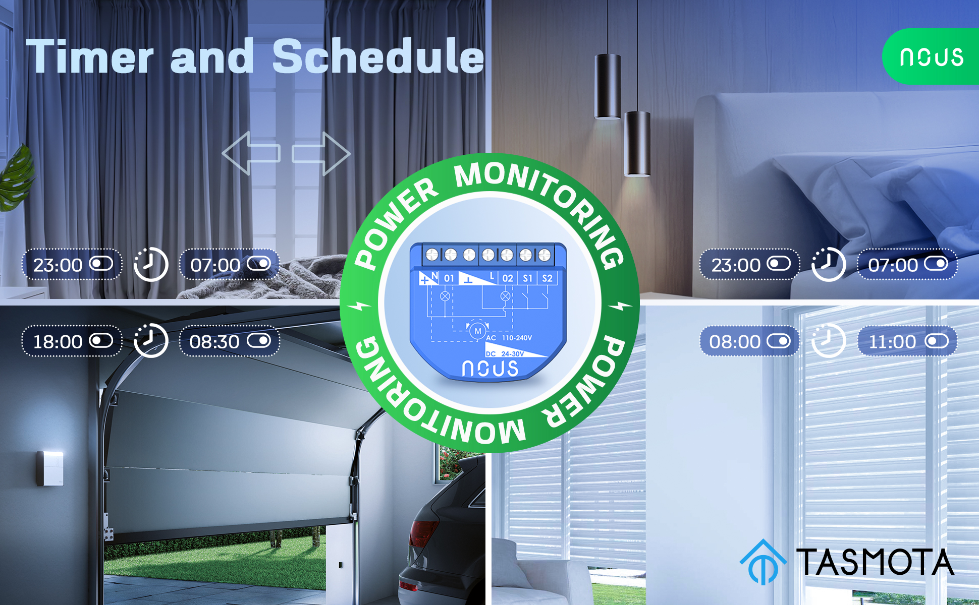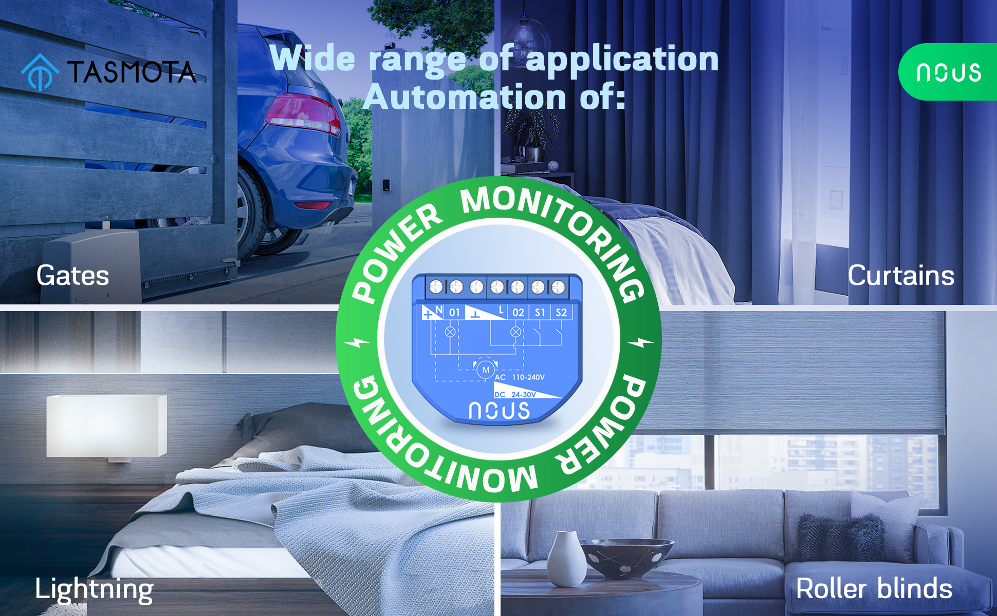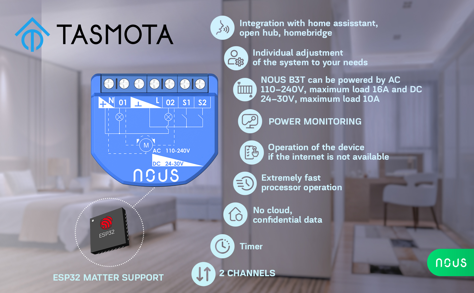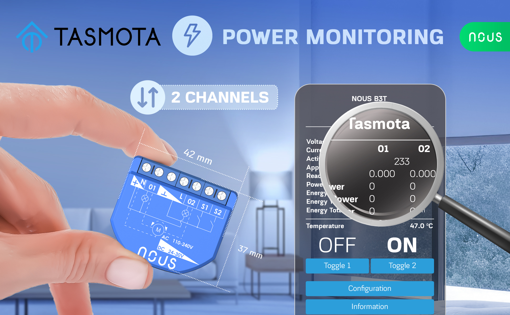 Modul Nous B3T je navrhnutý na inštaláciu do elektroinštalačnej krabice za klasický vypínač alebo priamo do zariadenia. Napája sa striedavým napätím 100–240 V AC alebo jednosmerným napätím 24–30 V DC. Po zapojení do elektrického okruhu sa zariadenie pripojí do WiFi siete a je možné ho konfigurovať cez webové rozhranie alebo integrovať do systému Home Assistant pomocou MQTT. Vďaka dvom nezávislým kanálom je možné ovládať dve zariadenia alebo využiť špeciálny režim na riadenie motora roliet. Modul zároveň umožňuje sledovanie spotreby energie jednotlivých okruhov.