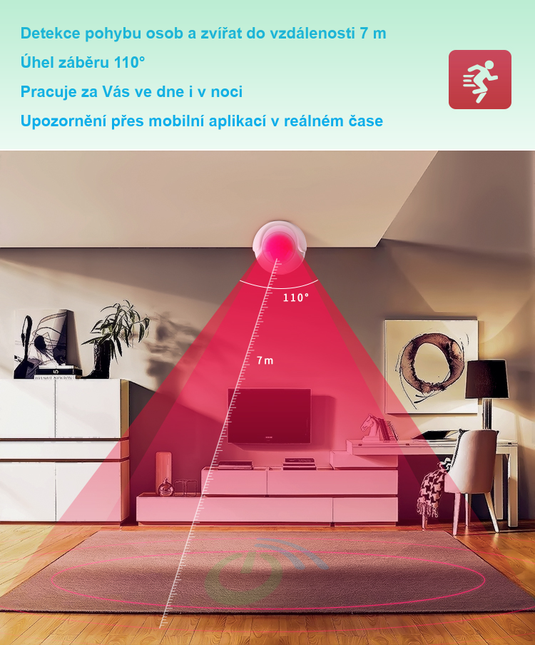 - Široký uhol záberu 110 ° a dosah až 7 m