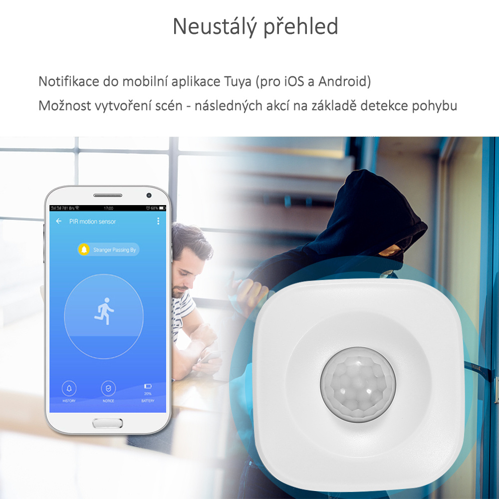 Smart pohybový senzor môžete využiť na automatizácie a zabezpečenie domácnosti. Prostredníctvom ZigBee brány ho môžete prepojiť s aplikáciou Tuya a hlasovými asistentmi Google Assistant a Amazon Alexa. Pri detekcii pohybu môže automaticky spustiť alarm, aktivovať kamery alebo rozsvietiť smart osvetlenie. V aplikácii je možné nastaviť rôzne scenáre a časové plány, takže domácnosť reaguje automaticky bez nutnosti manuálneho ovládania.