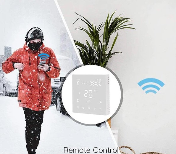 ZigBee termostat, vhodný pre priamkové spotrebiče, s maximálnym spínaným prúdom 16 A, ovládaný pomocou aplikácie Tuya (pre iOS alebo Android).