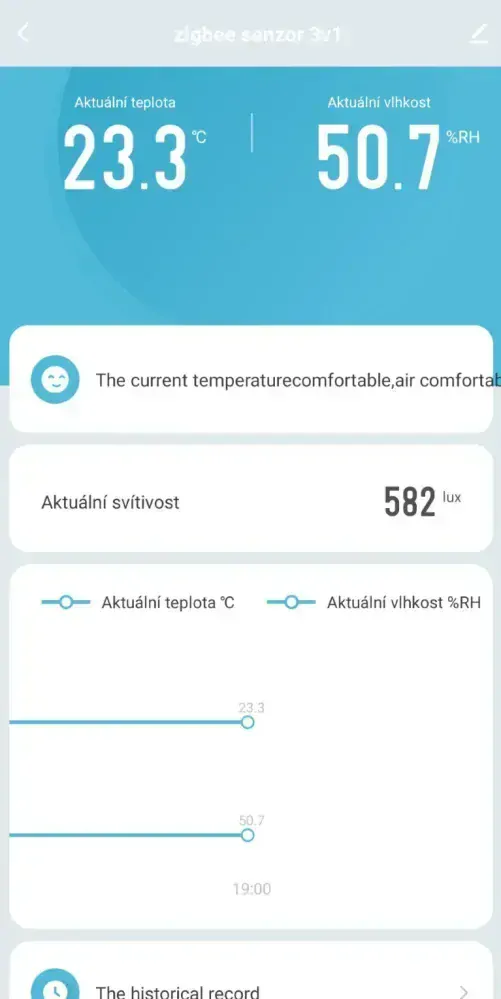 - Namerné údaje posiela do aplikácie Tuya vždy, pri prekročení predom definovanej medze, ktorú sa nám nepodarilo zmeniť (na rozdiel od podobných WiFi senzorov WiFi Senzor / Budík 4v1 a WiFi TH Senzor 3v1 Smartica).